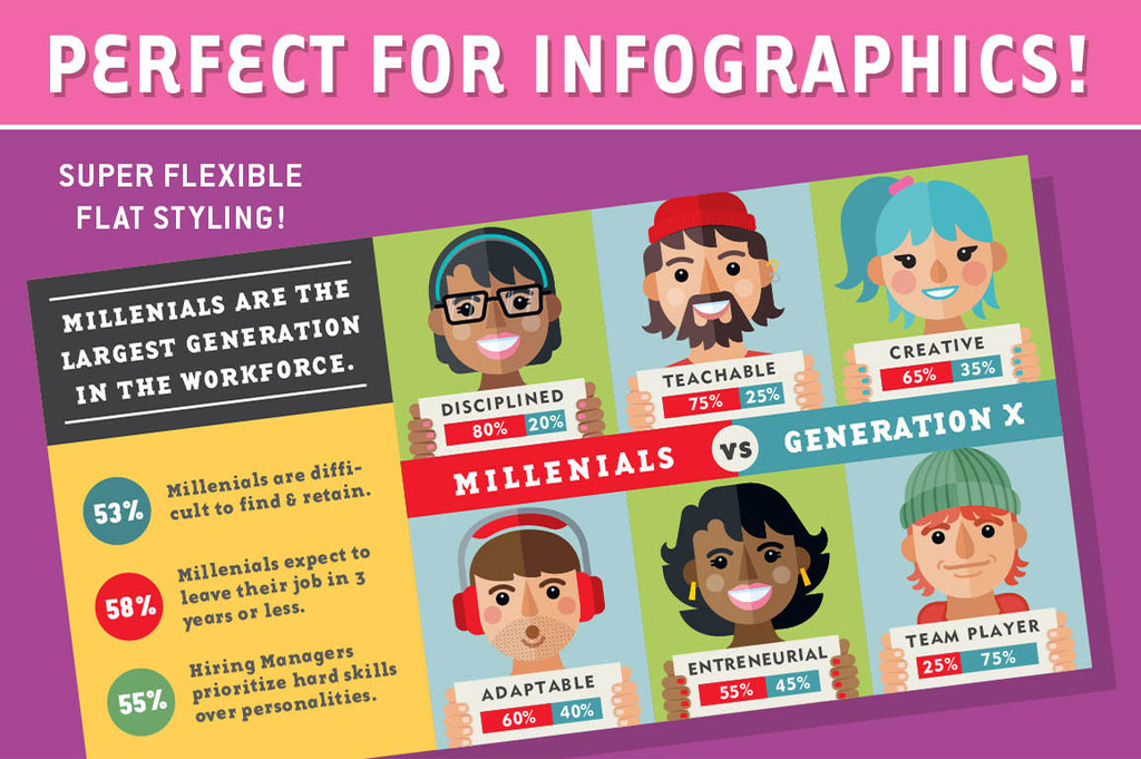 Not only will you be able to drop in the Perfect faces, you have the ability to customize the vector art quickly in Adobe Illustrator to Nail the perfect look and feel needed. Your Infographic will Absolutely AMAZE your client as well as her finicky audience. Your client is getting clicks and accolades and she has you and your new AVATARs to thank!
